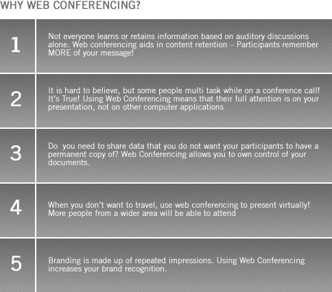 For the TV & Internet Generation, Web Conferencing is important to holding your participants attention. Visuals are an important part of making your message memorable.